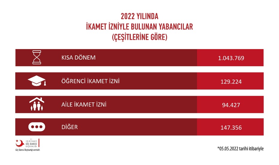 17 MAY 2022 2022 Yılı İkamet İzni Çeşitlerine Göre Türkiye' de Bulunan Yabancılar 17.05.2022 09:17 0 Yorum 387 Görüntülenme Beğeni 2022 Yılında Türkiye' de Bulunan Yabancıların sayısı şu şekildedir; • Kısa Dönem : 1.043.769 • Öğrenci İkamet İzni : 129.224 • Aile İkamet İzni : 94.427 • Diğer : 147.356 Paylaş: