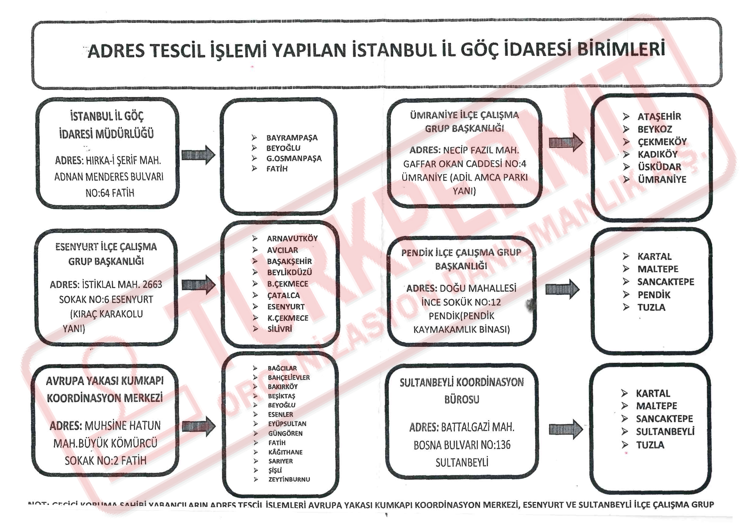 İstanbul ilinde ikamet izni olan yabancılar, oturdukları ilçeye göre aşşağıda bulunan listeye göre Göç İdaresi Müdürlüklerine giderek adres sistemine kayıt olabilirler.