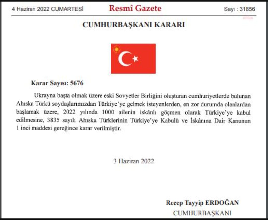 "Ukrayna başta olmak üzere eski Sovyetler Birliğini oluşturan cumhuriyetlerde bulunan Ahıska Türkü soydaşlarımızdan Türkiye'ye gelmek isteyenlerden, en zor durumda olanlardan başlamak üzere, 2022 yılında 1000 ailenin iskanlı göçmen olarak Türkiye'ye kabul edilmesine 3835 Sayılı Ahıska Türklerinin Türkiye'ye Kabulü ve İskanına Dair Kanunun 1'inci maddesi gereğince karar verilmiştir."