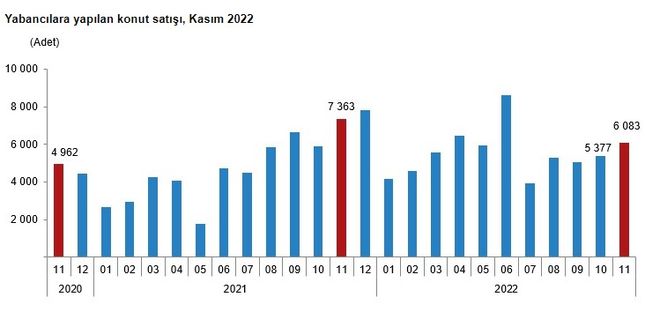 Yabancılara yapılan konut satışları Kasım ayında bir önceki yılın aynı ayına göre yüzde 17,4 azalarak 6 bin 83 oldu. Kasım ayında toplam konut satışları içinde yabancılara yapılan konut satışının payı yüzde 5,2 oldu. Yabancılara yapılan konut satışlarında ilk sırayı 2 bin 616 konut satışı ile Antalya aldı. Antalya'yı sırasıyla bin 733 konut satışı ile İstanbul ve 567 konut satışı ile Mersin izledi.