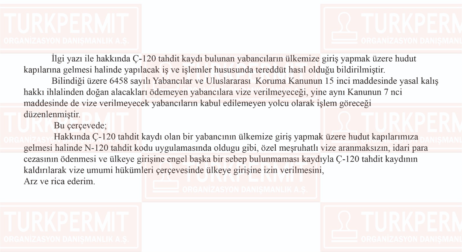 İlgi yazı ile hakkında Ç-120 tahdit kaydı bulunan yabancıların ülkemize giriş yapmak üzere hudut