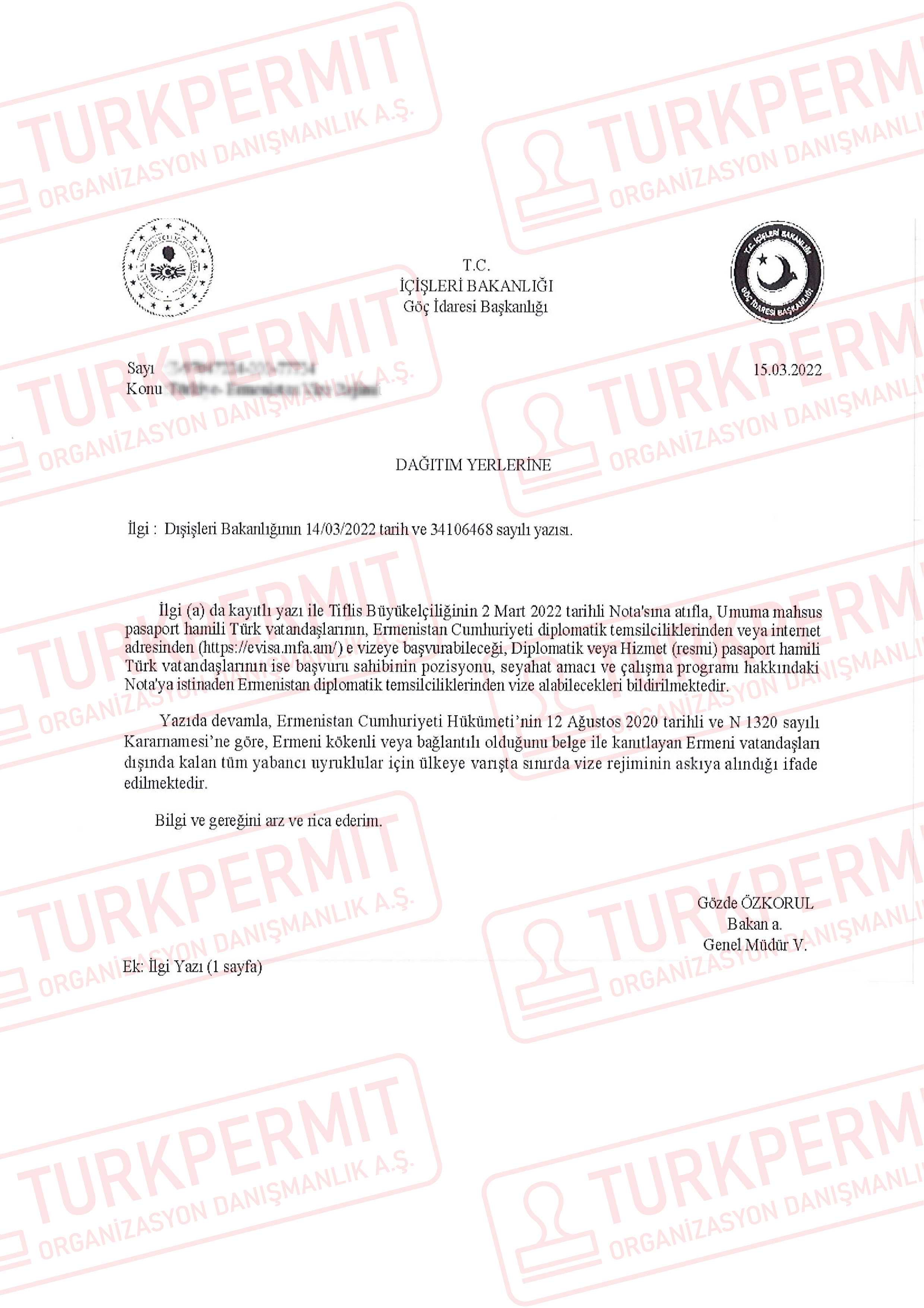 Ermenistan Cumhuriyeti Hükümeti nin 12 ;Ağustos 2020 tarihli ve N 1320 sayılı Kararnamesi’ne göre, Ermeni kökenli veya bağlantılı olduğunu belge ile kantlayan Ermeni vatandaşları dışında kalan tüm yabancı uyruklular için ülkeye varışta sınırda vize rejiminin askıya alındığı ifade edilmektedir.