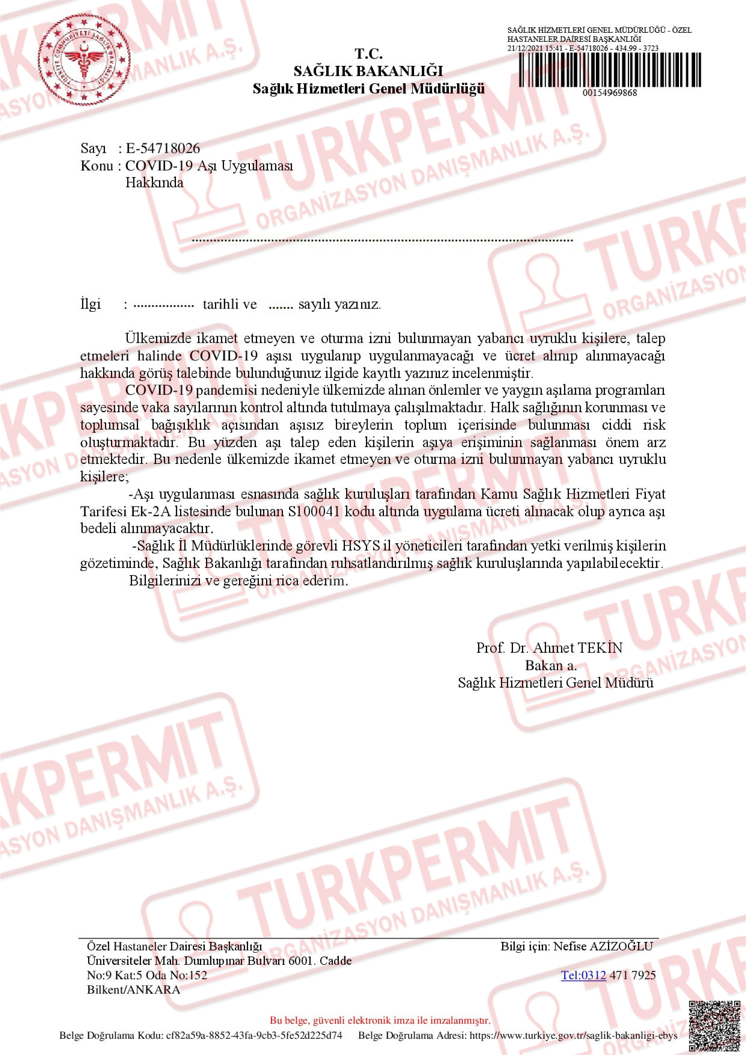 COVID-19 pandemi nedeni ile ülkemizde alınan önlemler ve yaygın aşılama programları sayesinde vaka sayılarının kontrol altında tutulmaya çalışılmaktadır. Halk sağlığının korunmasi ve toplumsal bağışıklık açısından aşısız bireylerin toplum içerisinde bulunması ciddi risk olusturmaktadır. Bu yüzden aşı talep eden kisilerin aşiya erisiminin saglanmasi önem arz etmektedir. Bu nedenle ülkemizde ikamet etmeyen ve oturma izni bulunmayann yabancı uyruklu kişilereİ