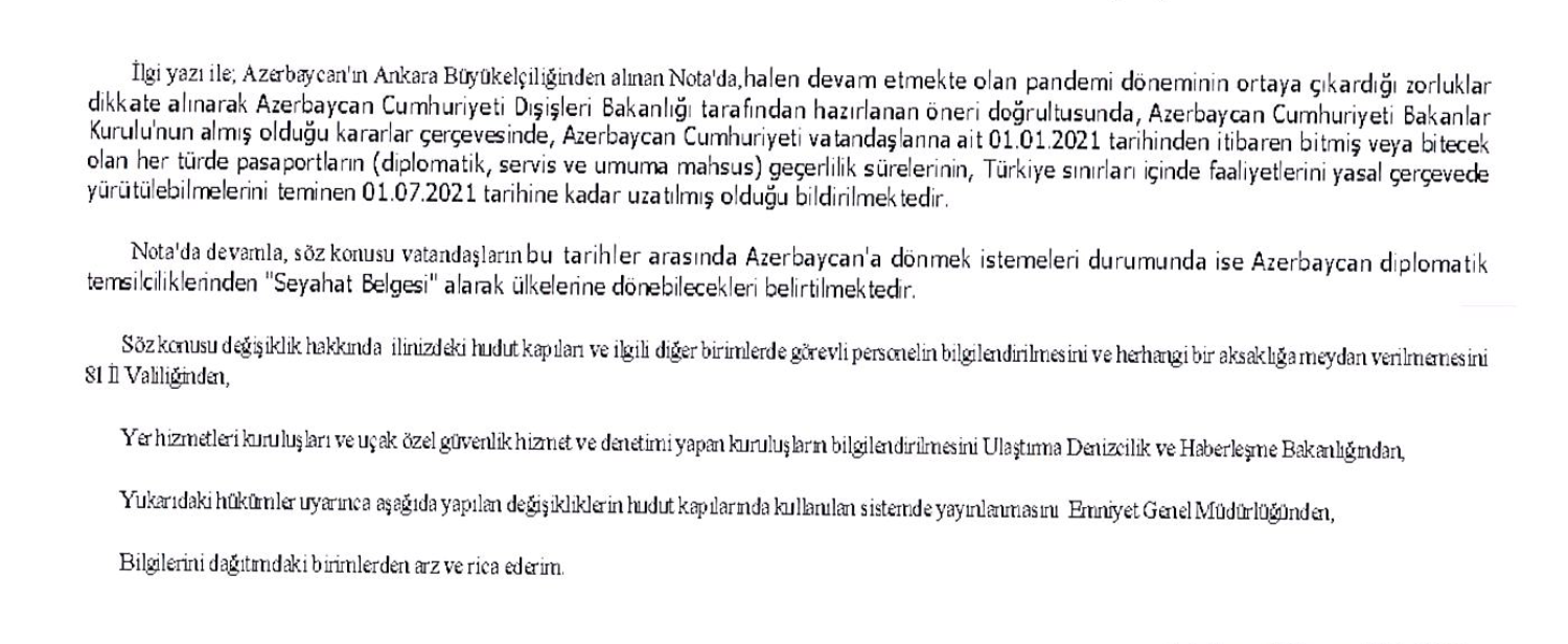 * 01.01.2021 TARİHİNDEN SONRA SÜRESİ DOLAN AZERBAYCAN (DİPOLOMATİK, SERVİS VE UMUMA MAHSUS) PASAPORTLARI 01.07.2021 TARİHİNE KADAR GEÇERLİ SAYILACAKTI.