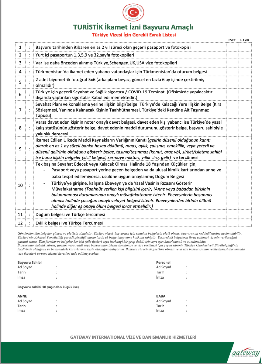 Tüm formlar ve belgeler her kişi için ayrı ayrı hazırlanmalı ve sunulmalıdır (aile Üyeleri veya herhangi bir grup dahil).