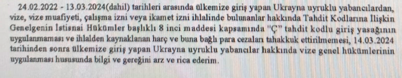 " 24.02.2022 tarihinden sonra Türkiye'ye giriş yapan, ve 13.03.2024 tarihine Türkiye'de bulunupta kaçak durumda kalmış ola Ukrayna vatandaşlarına aynı şekilde Ç kodu yani giriş yasağı ve para cezası uygulanmayacak. "