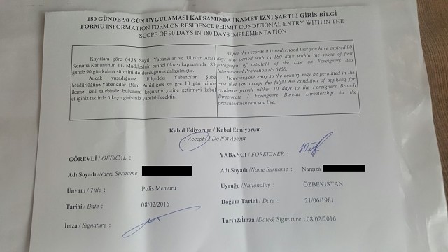 Türkiye de ikamet izni almadan 180 günde 90 gün kalma süresini tamamlayan yabancılar, şartlı giriş yapıp (v84) 10 gün içinde randevu alıp Göç İadresine ikamet izni almak için gitmezlerse veya ikamet talebinde bulunup ikamet izni alamazlarsa kendilerine süreli giriş yasağı koyulur.
