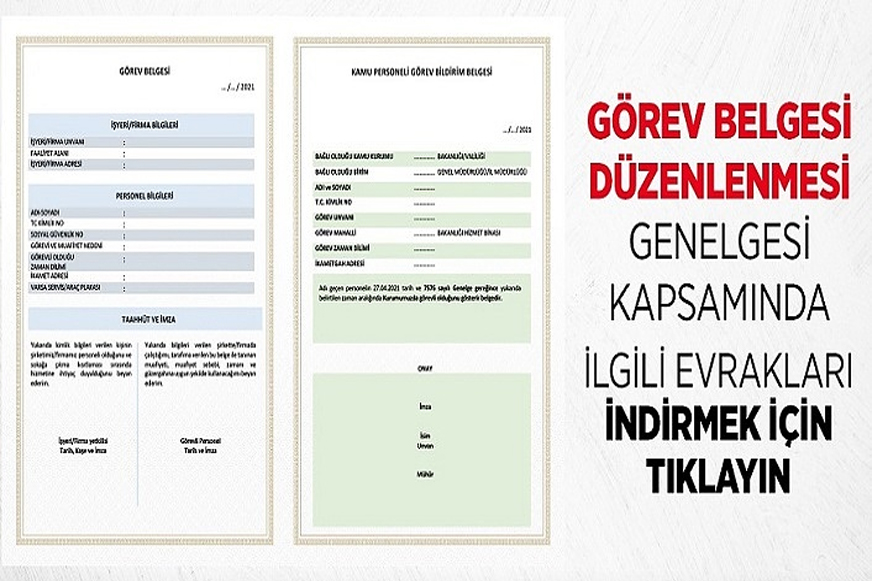 Genelgede, salgınla mücadele sürecinde; muafiyetlerin suiistimal edilmemesi, hastalığın yayılımı ve başta sağlık çalışanları olmak üzere toplumsal yükün artmaması açısından son derece önemli olduğu belirtilerek, üretim, imalat, tedarik ve lojistik sektörleri başta olmak üzere daha önce genelgelerle muafiyet tanınan işyerlerinde çalışan görevliler için bu işyerlerinin yetkililerince tüm belgelerin geçerliliğin 2 Mayıs 2021 Pazar günü saat 24.00’de sona ereceği ifade edildi. Genelge görev belgeleri ile ilgili şu bilgilere yer verildi: