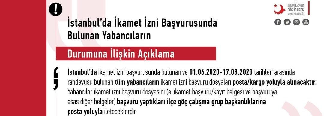 İstanbul’da ikamet izni başvurusunda bulunan ve 01.06.2020-17.08.2020 tarihleri arasında randevusu bulunan tüm yabancıların ikamet izni başvuru dosyaları posta/kargo yoluyla alınacaktır. Yabancılar ikamet izni başvuru dosyasını (e-ikamet başvuru/kayıt belgesi ve başvuruya esas diğer belgeler) başvuru yaptıkları ilçe göç çalışma grup başkanlıklarına posta/kargo yoluyla ileteceklerdir.