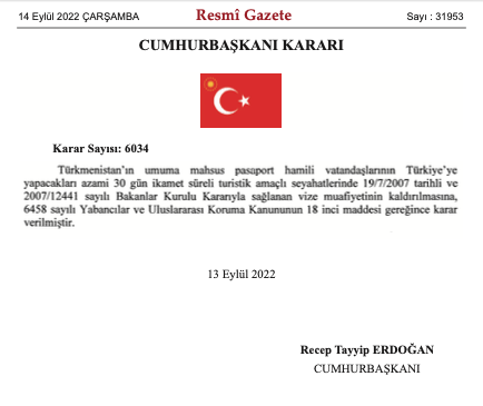 Resmi Gazete'de yayımlanan karara göre, Türkmenistan’ın umuma mahsus pasaport hamili vatandaşlarının Türkiye’ye yapacakları azami 30 gün ikamet süreli turistik amaçlı seyahatlerinde sağlanan vize muafiyeti kaldırıldı.