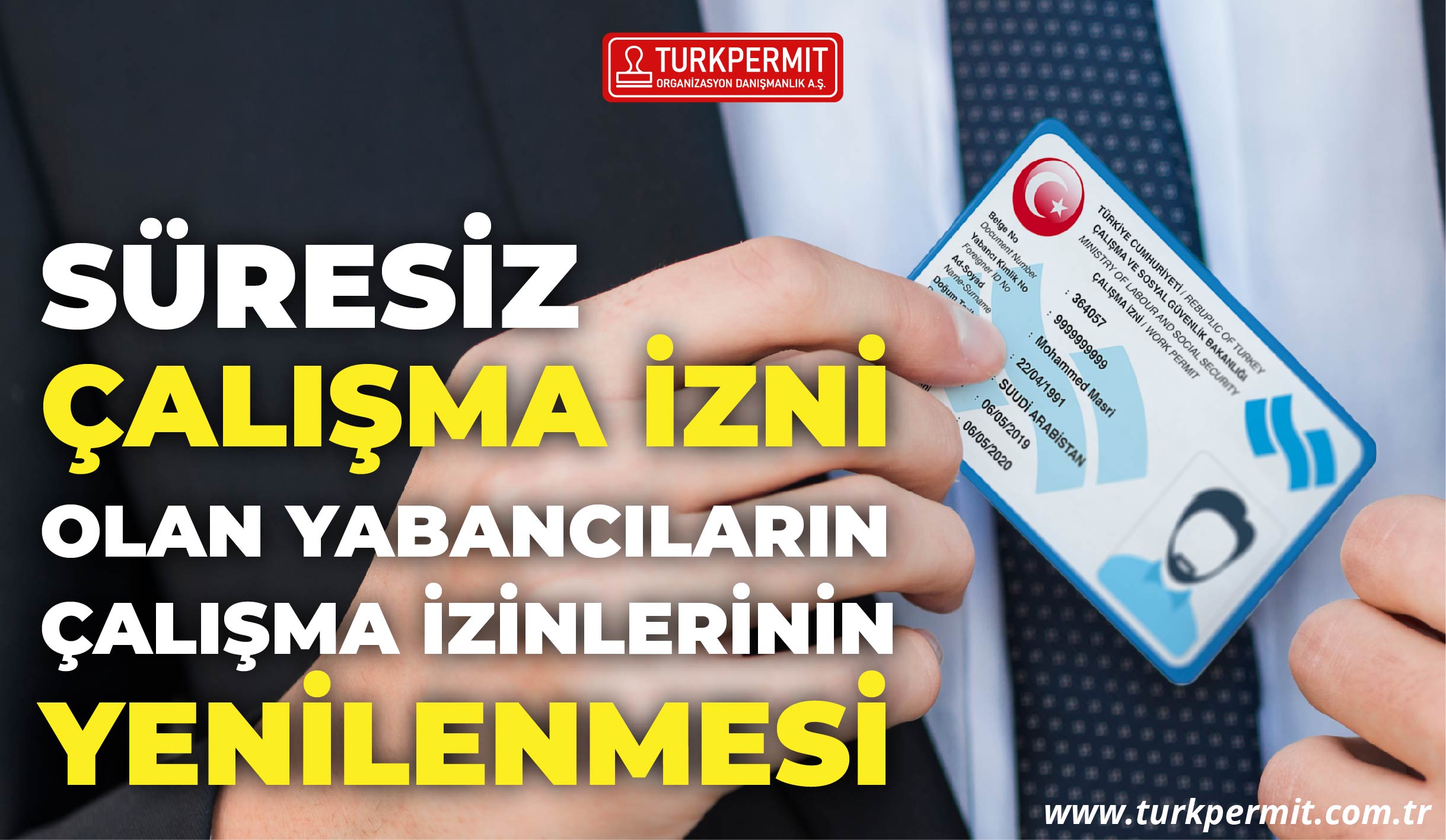 Türkiye'de uzun dönem ikamet izni veya en az sekiz yıl kanuni çalışma izni olan yabancılar süresiz çalışma iznine başvurabilir. Ancak, yabancının başvuru şartlarını taşıması yabancıya mutlak hak sağlamaz. Süresiz çalışma izni belgeleri çalışma izni başlangıç tarihi itibarıyla her beş yılın sonunda yenilenmektedir. Belge yenileme başvurusu süresiz çalışma izni başlangıç tarihinden itibaren beş yıllık sürenin dolmasından önceki altı ay içerisinde ve her halükarda süre dolmadan yapılmaktadır.