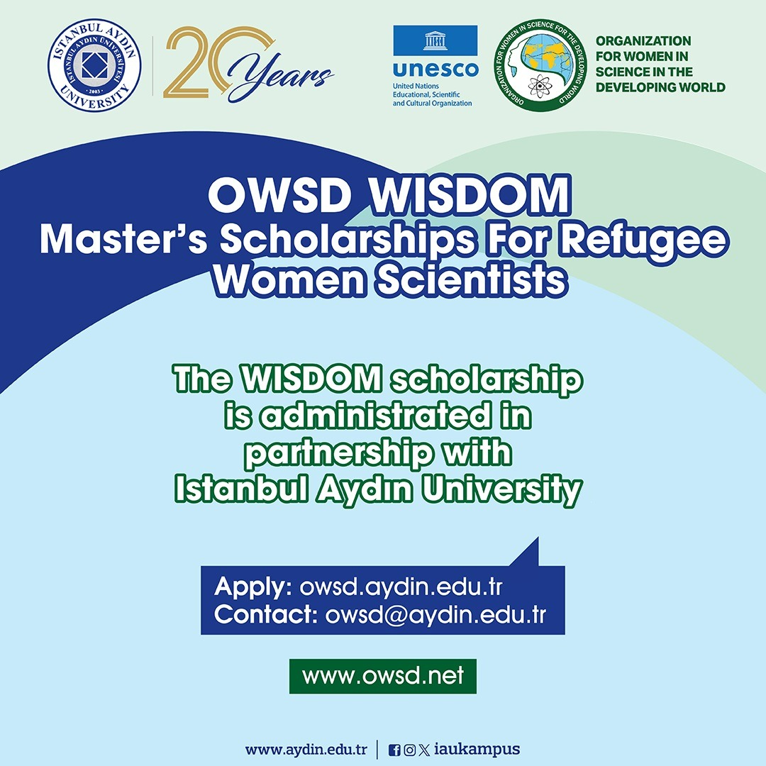 İstanbul Aydın Üniversitesi (IAU) ve UNESCO Gelişmekte Olan Dünya İçin Kadın Bilimciler Örgütü (OWSD), yerinden edilmiş ve koruma statüsünde bulunan kadınların Türkiye’de yüksek lisans programlarında eğitimlerini sürdürmelerine destek olmak için tam burslu bir program sunmak üzere iş birliği yapmaktadır.